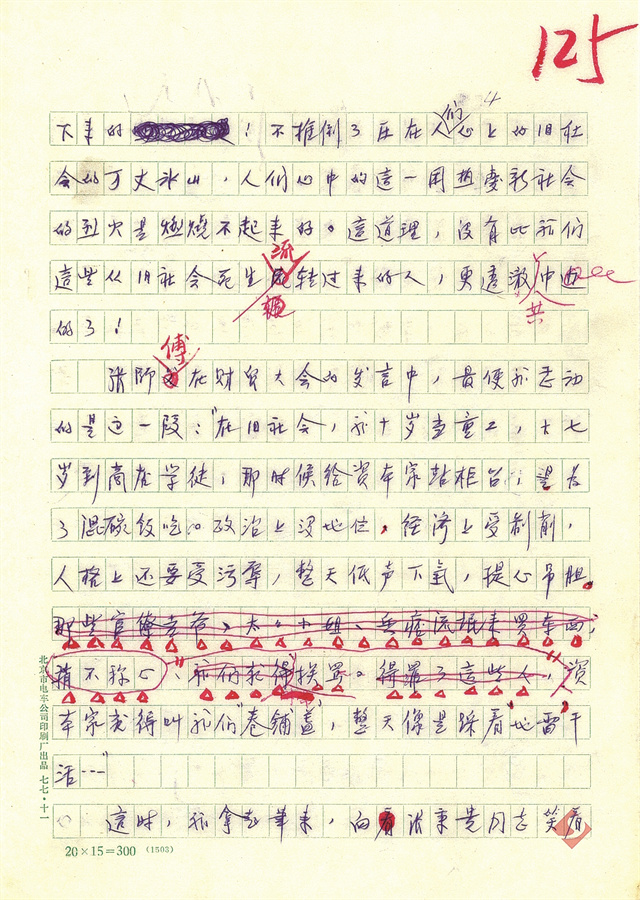1978年7月13日,《颂“一团火”》完成。7月17日,周明在稿笺上概括了这篇作品的一些特点,“文章顺着报纸‘一团火’的路子,主要追究‘火’从何而来,多半篇幅写了旧社会张师傅的苦难生活”,并且“大量引用了群众给张师傅的来信”。总体而言,该作品的特点是亲切生动,感情充沛,引用大量青年来信使文本产生了鲜明的“对话感”,也极具生命力,有着较为独特的情感质地。原稿为7000字,由周明作了一些删改后,压缩为6500字。这些留存于手稿与稿笺之上的思考与文字修改痕迹,展现的是作品从底稿到刊发的生产过程,也是报告文学在新时期火热的生产现场的忠实记录,以及对时代脉搏的深情应和。手稿的价值恰恰在于它所保留的、被定稿所掩盖的“多声道”叙事。手稿定格了1970年代末的时代话语和语言风貌,“全国财贸学大庆学大寨会议”之类的政治短语、“同志”“师傅”的选用,是政治话语与文学表达关系的见证。被删改的部分作为一个未尽的“潜在文本”,存在于手稿之上,为读者和研究者提供了想象文本的空间。