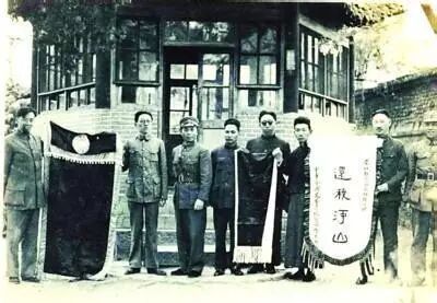 郁达夫(右二)等人向李宗仁(左三)献旗