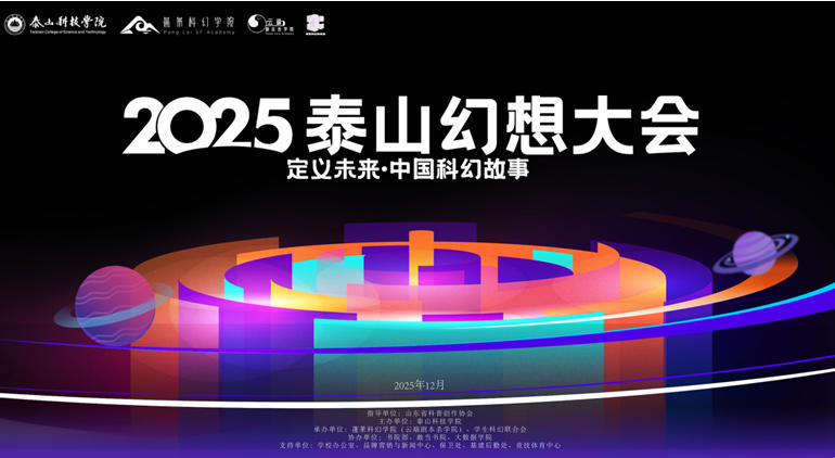 12月6日至7日,由山东省科普创作协会指导,泰山科技学院主办,蓬莱科幻学院(云端剧本杀学院)、学生科幻联合会承办的2025泰山幻想大会系列活动在山东泰安泰山科技学院举行,本次活动的主题为“定义未来:中国科幻故事”。中国作协主席团委员、中国作协科幻文学委员会主任刘慈欣,中国科幻银河奖、华语科幻星云奖终身成就奖获得者王晋康,科普时报社社长、中国科普作家协会原副理事长尹传红,世界华人科幻协会主席韩松,复旦大学中文系教授、博士生导师严锋,泰安市科协四级调研员陈金辉、科普部部长韩盛涛,泰山科技学院常务副校长谢承红、副校长丁海奎、校长助理武浩然,重庆移通学院通识教育学院执行院长皮若兰,蓬莱科幻学院(云端剧本杀学院)副院长宋亚洁,以及杨枫、杨平、凌晨、江波、宝树、超侠、杨晚晴、分型橙子、海漄、孙强、游者、袁振民、姚明、钛艺、伯爵大人、贾天轲等科幻作家、编辑、评论家、从业者,《科幻与想象力》通识课程学生代表和齐鲁科幻联盟学子500余人参加了本次活动。