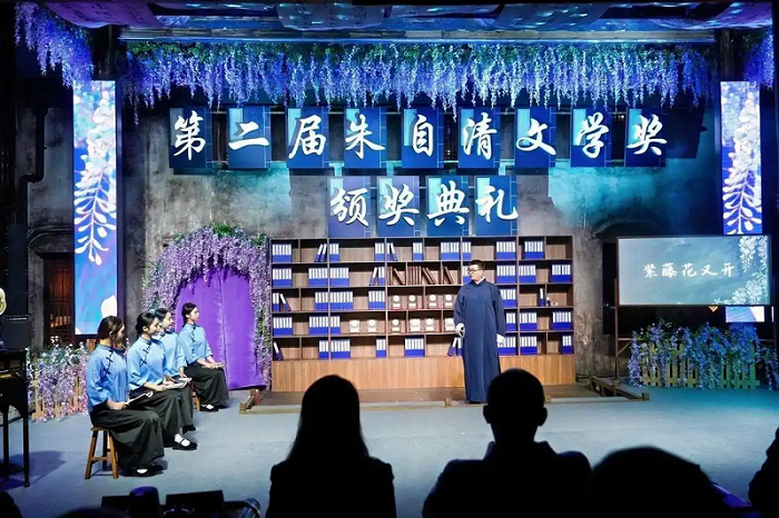 本次颁奖典礼以极具沉浸感的形式拉开序幕。随着“各位客官,且入内——”的画外音响起,百年前的大书场茶馆场景仿佛重现,让现场观众瞬间穿越时空,置身文学故事之中。行为表演《时光啊,你慢些走》勾勒出岁月流转的诗意,引子《一堂课》则以情景再现的方式,还原了1922年朱自清先生在临海执教时与学生探讨新诗、畅谈文学的场景。学生们对《毁灭》等诗作的好奇与追问,朱自清先生“一步步踏在泥土上,打上深深的脚印的深情吟诵,不仅展现先生与临海的深厚情感,更传递出文学精神代代相传的力量。