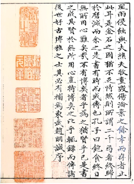 江南是明清藏书史的核心之地。研究书籍史的学者,喜欢讲书籍的环流。“十卷本”《金石录》在江南的流转,吸引诸多金石学家、藏书家,吸引达官贵人、诗人词家、闺秀才女登台亮相,营造出江南藏书的文化氛围。这样难得的宋著宋刻,这样珍贵的人事因缘及其交集,能够为你我所见、所知,真是我们的福分。