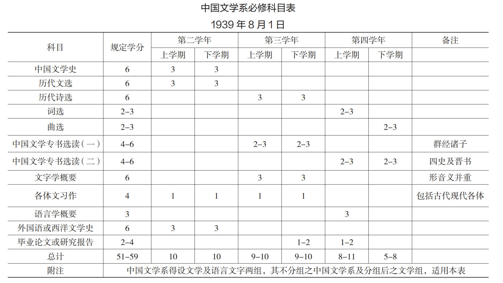 课程制定是学科教育的重要环节,关乎教学的质量和成败。何为必修?何为选修?都需要经过学理的探讨和科学的考量。1938年,中文系课程草案由朱自清和罗常培拟定,再由教育部送请各校专家学者签署意见,根据大学课程会议的讨论结果,教育部颁布了中国文学系必修、选修科目表。