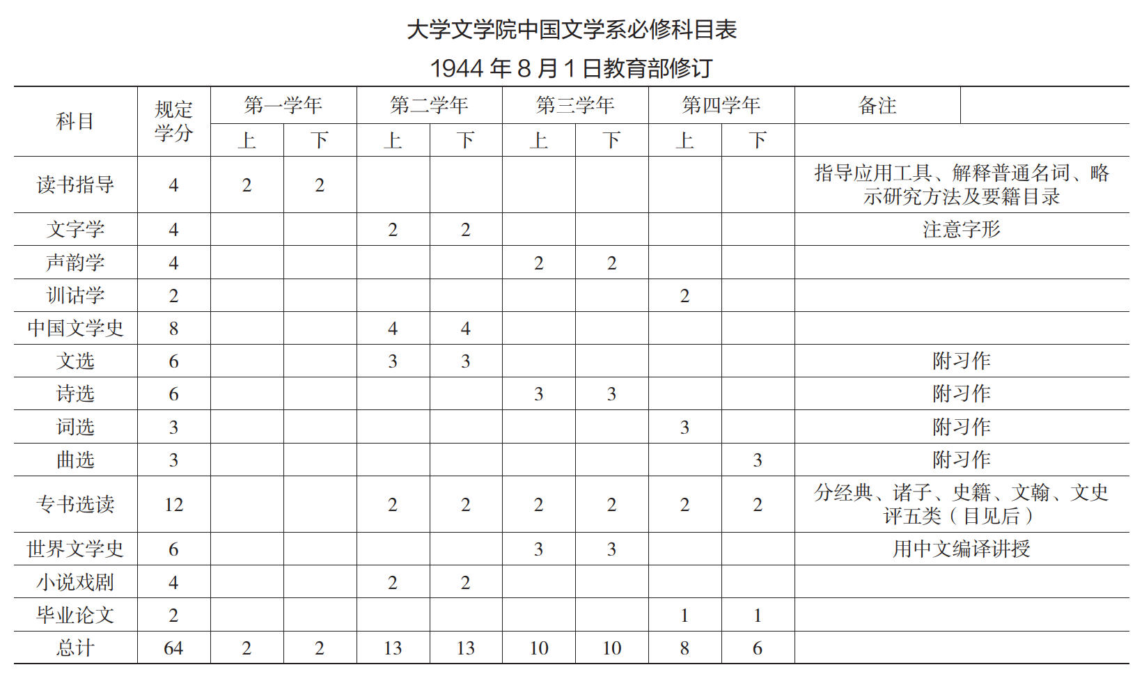 1944年8月1日,教育部召开第二次大学课程会议,修订了《大学文理法师范四学院共同必修科目表》及《分系必修选修科目表》。文学院中国文学系及师范学院国文系由汪辟疆、汪东作为召集人,另有罗根泽、伍俶傥、魏建功、卢前、陈石珍、相菊潭、戴应观、温子瑞、段天炯参与讨论,所修订的文学院中国文学系科目表如下所示: