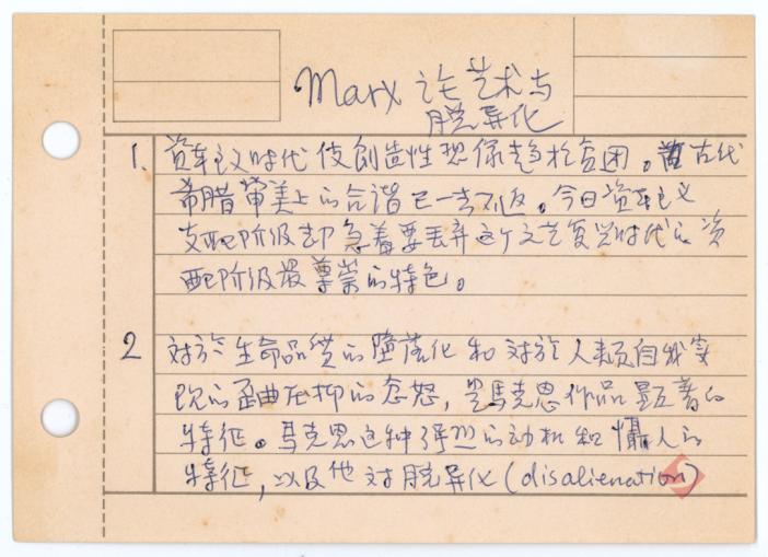 陈映真笔记卡片《Marx论艺术与脱异化》首页