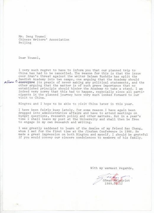 1989年3月12日马悦然致邓友梅信