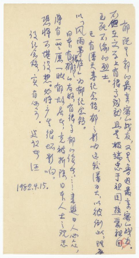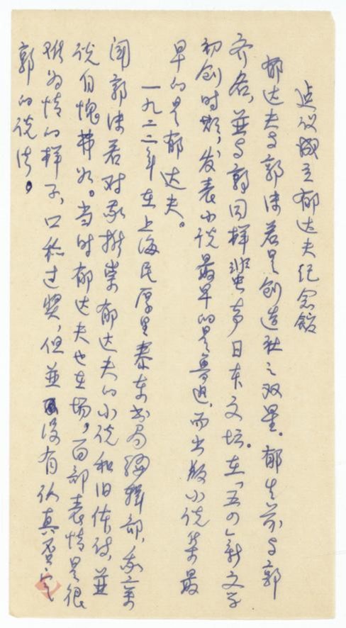 与传统的对话,亦在空间维度上拓展着它的疆界。今年也是郁达夫诞辰130周年。馆藏中有许多作家怀念郁达夫先生的手稿,其中汪静之于1982年4月15日写下的《建议成立郁达夫纪念馆》一文中认为郁达夫“不但在文学上有很高成就,且是极端忠于祖国、热爱祖国,至死不渝的烈士”,“理应以‘风雨茅庐’为郁纪念馆”。1986年,郁达夫旧居成为市级文物保护单位,后成为省级文物保护单位。值得一提的是,前不久,海外首座郁达夫纪念馆在印度尼西亚苏门答腊岛棉兰市落成开馆。名人故居、纪念馆,正从静态的“纪念地”转化为流动的“文化场域”,成为与世界人民对话、英烈精神烛照后人的重要空间。
