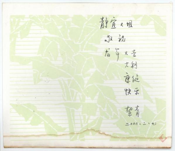 如果说徐刚的祝福是宏大的抒情,那么胡絜青致友人盛成、李静宜的一系列贺年卡,则展现了文人交往中细水长流的温情与风骨。胡絜青是著名画家,齐白石的学生,也是作家老舍的夫人。胡絜青与盛成曾在“中华全国文艺界抗敌协会”共事。在1993年,胡絜青在给盛成夫妇的贺年卡写下:“金鸡贺卡谢盛兄,望重德高老寿星;敬读诗才多韵味,深化改革硕果荣。”贺卡的背面,是其代表画作《傲霜图》,展现了画家在寄送贺年卡时的用心。在1997年,她写下:“敬爱的盛成老寿星 贤淑的仁嫂静宜 祝愿你们新春新禧 健康长寿 春节快乐 诸事吉祥”,贺年卡附有红色的如意图案,极具巧思。2000年寄送的贺年卡上,写的是“龙年大吉大利 康健快乐”。祝福虽简单,却蕴含着一年又一年的深切牵挂。这些精心构思的方寸纸卡,延续了中国文人“诗书画印”一体传情的传统,见证的是一个文化圈层的精神风貌。
