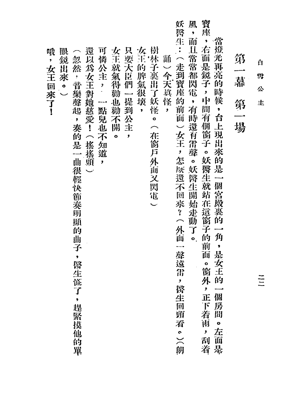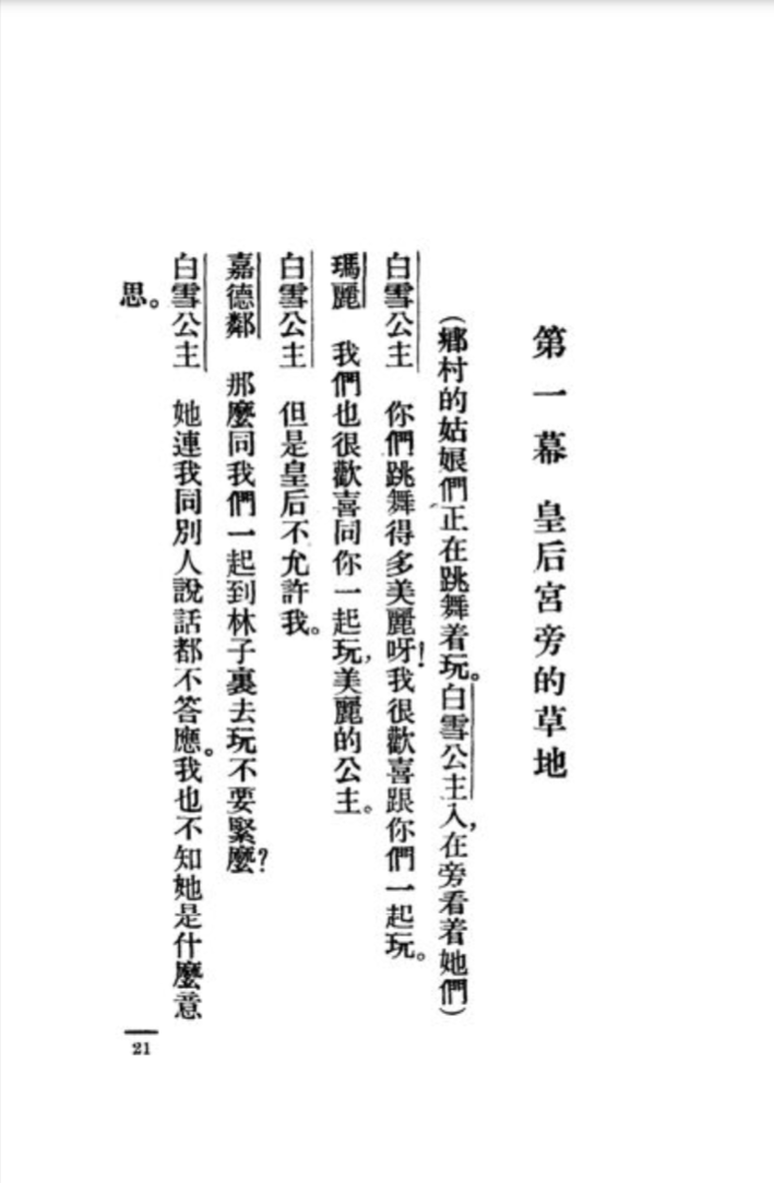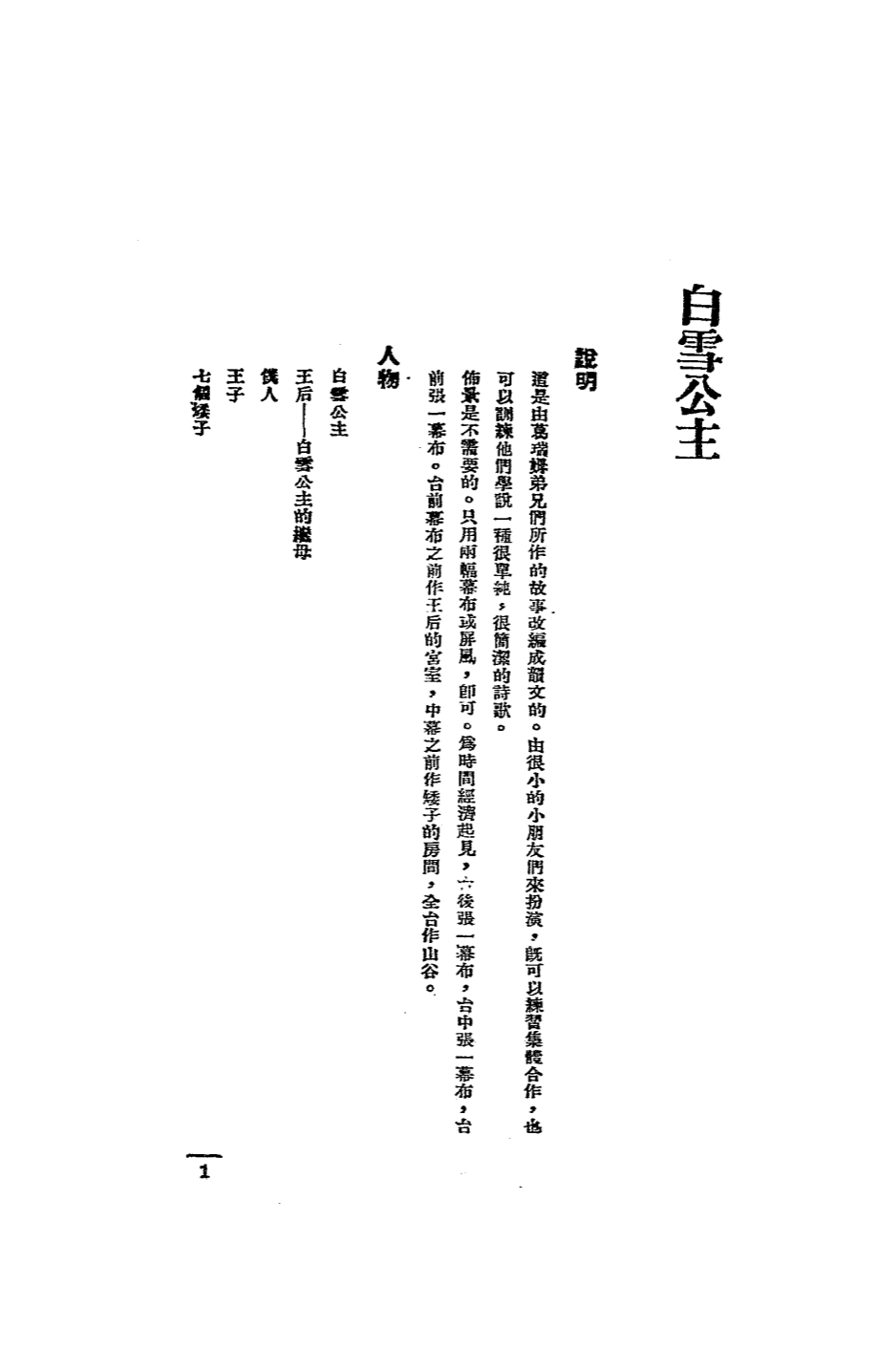 陈治策翻译的若得奈·本奈特所著六场儿童剧《白雪公主》(文通书局,1948年)也是“由葛瑞姆弟兄们所作的故事改编成韵文”(《说明》)。作者的重心并没有放在舞台布置上,所以布景安排极其简单;也不强调情节的曲折变化,以致把王后的三种谋害手段压缩在一次行动中轮番上场;而是特别注意通过朗朗上口的台词,来呈现不同角色的性格特征。译者对此也心领神会,努力传达原来的意趣。比如当王后得知公主并未死去后,便处心积虑地开始盘算着:“我认识这处房子。在天一亮,/我端一个托盘,装扮成一个吉卜西姑娘,/沿着我知道的那一条小路一直走上,/不要一点钟的耽搁,我这就往那里闯,/我一定要和她算一算这笔账。/我要使用这把有毒的梳子去杀白雪。/或者,就使用这把刀子,也许妥当。/如果她要设法逃脱,/这个魔苹果,又绿,又红的漂亮,/就可以教她熟睡像死了的一样。”(第四场)白雪公主和小矮人们在一起,举手投足间透露出温婉善良的性格:“阳光照耀得温暖,清朗,/我在这里真是舒畅。/我把这些杯子碟子都洗光,/弄得整整齐齐的,你们尽管出去游逛。”(第五场)王子对公主一见倾心:“世上最可爱的女孩!/美丽的公主,我向你的手亲一亲。/请和我向那些花草中间走近,/你我在那个亭子上谈一谈心。”(第一场)为了拯救公主他又满怀自信和温情:“只有我才能/叫白雪从长眠中苏醒。/白雪,吾爱,你醒一醒。/你的好朋友在这里。请醒一醒。”(第六场)在齐心协力将王后“投在最深的地窖里边,/在魔山的最低的地方”(第六场)以后,众人同样围聚在一起唱歌跳舞。这应该很能调动起轻松欢乐的气氛,迅速感染现场的小观众们。