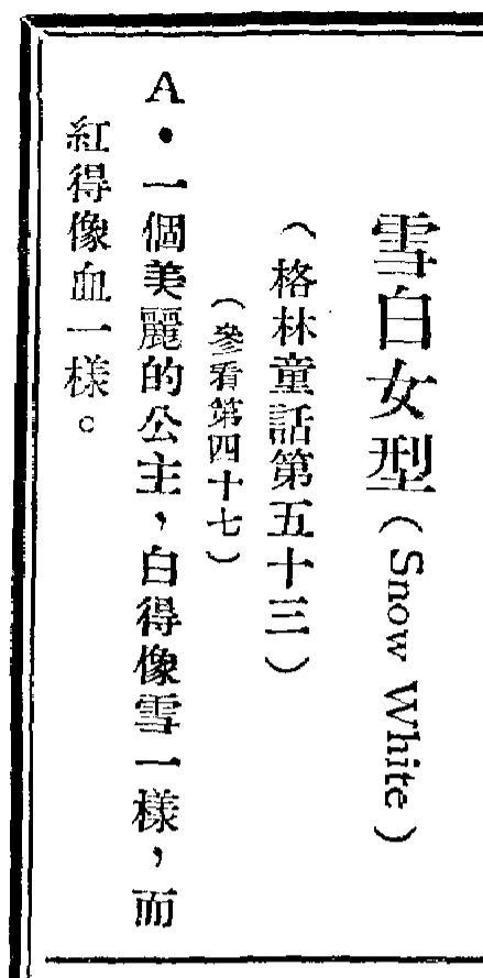 在清华大学外语系任教的美国学者翟孟生(R. D. Jameson)同样痴迷于研讨民间文学。他编纂的《童话型式表》里也列有“雪白女型(Snow White)”(于道源译,载《歌谣周刊》第二卷第二十九期,1936年),但将故事要素划分为五项,内容更为详备细致。例如其中C项“企图要杀死她”下又分出四个小项,缕述王后施展过的各种手段,包括“叫一个猎人杀死她”“一些有毒的花边”“一把有毒的梳子”和“一个有毒的苹果”,显然要比《印欧民间故事型式表》所说的“继女最后束手待毙”更加确切周详。另如D项中提到“那些守护着雪白女的强盗们(或矮人)用尽了方法使雪白女复活”,提醒读者注意格林童话里的小矮人,在其他同类型故事中或许摇身一变就成了强盗。时隔数十年,另一位美国民俗学家斯蒂·汤普森(Stith Thompson)在《世界民间故事分类学》(郑海等译、郑凡校,上海文艺出版社,1991年)里分析过民间故事在流传时的变异现象,也提到白雪公主型故事里的女主角会“被直接送到侏儒或强盗家”(第二部分《从爱尔兰到印度的民间故事》第二章《复合故事》),再次证实了这一点。